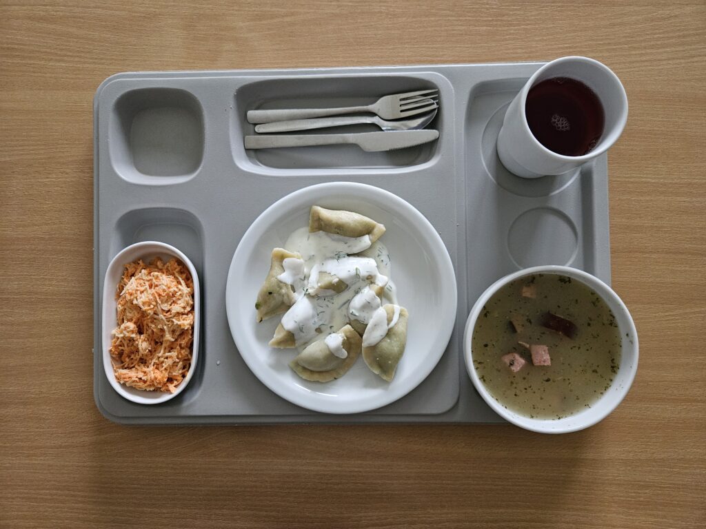 | Śniadanie: zupa mleczna z zacierką 300 ml (BIA, GLU, JAJ) herbata z cytryną 250 g chleb firmowy krojony (pszenno-żytni) 50 g (GLU, JAJ, ZIA) masło 82% tłuszczu 15g (BIA) chleb razowy krojony 50 g (GLU, JAJ, ZIA) Pasta jajeczna z papryką i szczypiorkiem 50 g (JAJ) sałata 20 g pomidor ze szczypiorkiem i pestkami dyni 150 g polędwica sopocka 30g (BIA, GLU, MIĘ, SEL,DWU) | Obiad: Żurek z kiełbasą 300 ml (BIA, GLU, MIĘ, SOJ, SEL) surówka z marchwi, seler, pietruszki i jabłka ze śmietaną 150 g (SEL) Kompot 250 g sos jogurtowo-koperkowy 100 g pierogi ze szpinakiem 300 g |