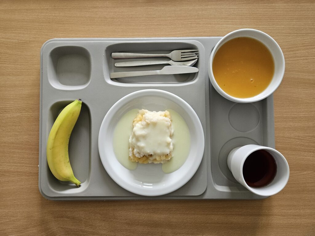 | herbata z cukrem 250ml Pieczywo razowe i zwykłe 100 g (GLU, JAJ, ZIA) masło 82% tłuszczu 10g (BIA) twarożek z zieleniną50 g (MLE) roszponka 20 g jogurt naturalny 150 g(BIA) sałatka z ogórka zielonego z rzodkiewką zieleniną i olejem rzepakowym 150 g szynka konserwowa 30g (BIA, GLU, MIĘ, SOJ, SEL, GOR) | Zupa owocowa z makaronem 300 ml (GLU, JAJ, SOJ, ZIA ) ryż na sypko 200 g udziec z kurczaka gotowany 120 g marchewka gotowana 150 g (GLU) sos potrawkowy 100 ml (GLU, JAJ, SEL) |