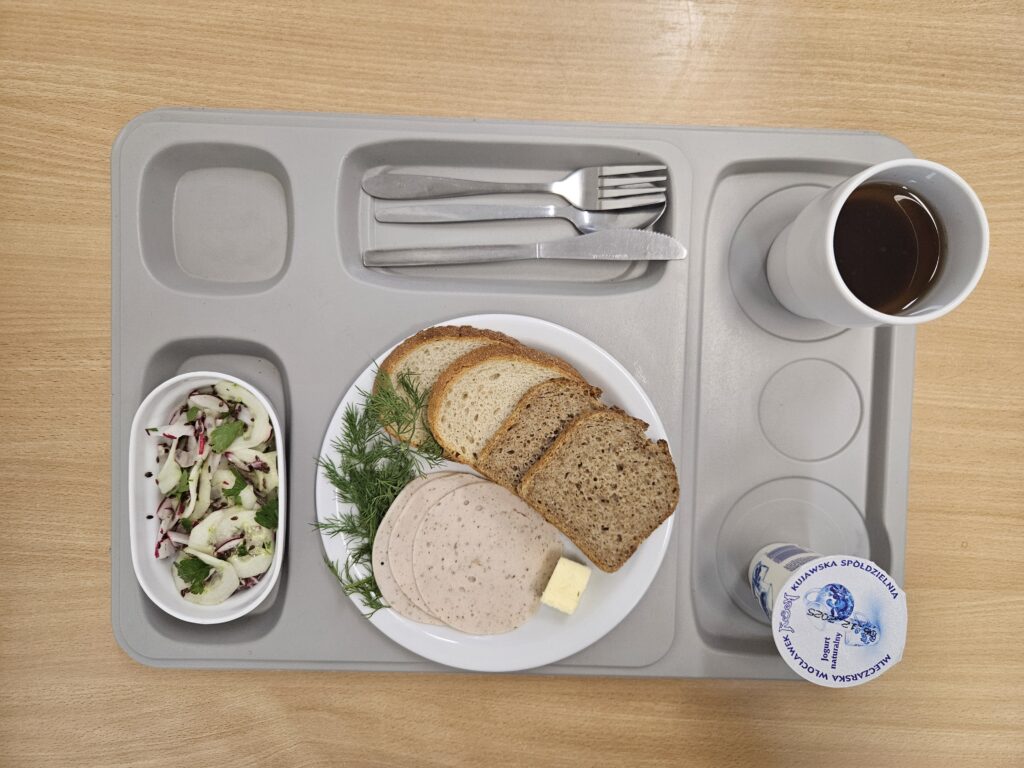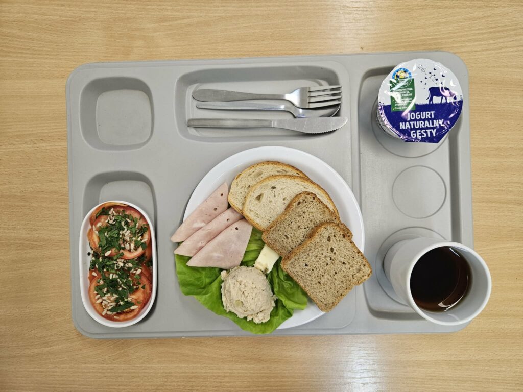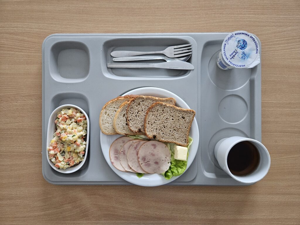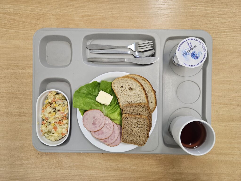 | Śniadanie: jogurt naturalny 150 g (BIA) herbata z cukrem 250 ml chleb firmowy krojony (pszenno-żytni) 50 g (GLU, JAJ, ZIA) chleb razowy krojony 50 g (GLU, JAJ, ZIA) szynka wieprzowa 50 g (BIA, GLU, SOJ, SEL, GOR) rukola 15 g masło 82% tłuszczu 15 g (BIA) pomidor z siemieniem lnianym 150 g Marmolada 50 g (DWU) | Obiad: Barszcz ukraiński z fasolą 300 ml (GLU, SEL, DWU, ROŚ) kotlet mielony wieprzowy smażony 100 g (GLU, JAJ, ZIA) ziemniaki z koperkiem 200 g surówka z kapusty kiszonej i olejem rzepakowym 150 g Kompot 250 g |