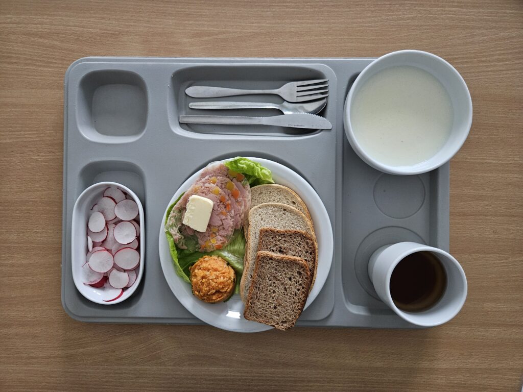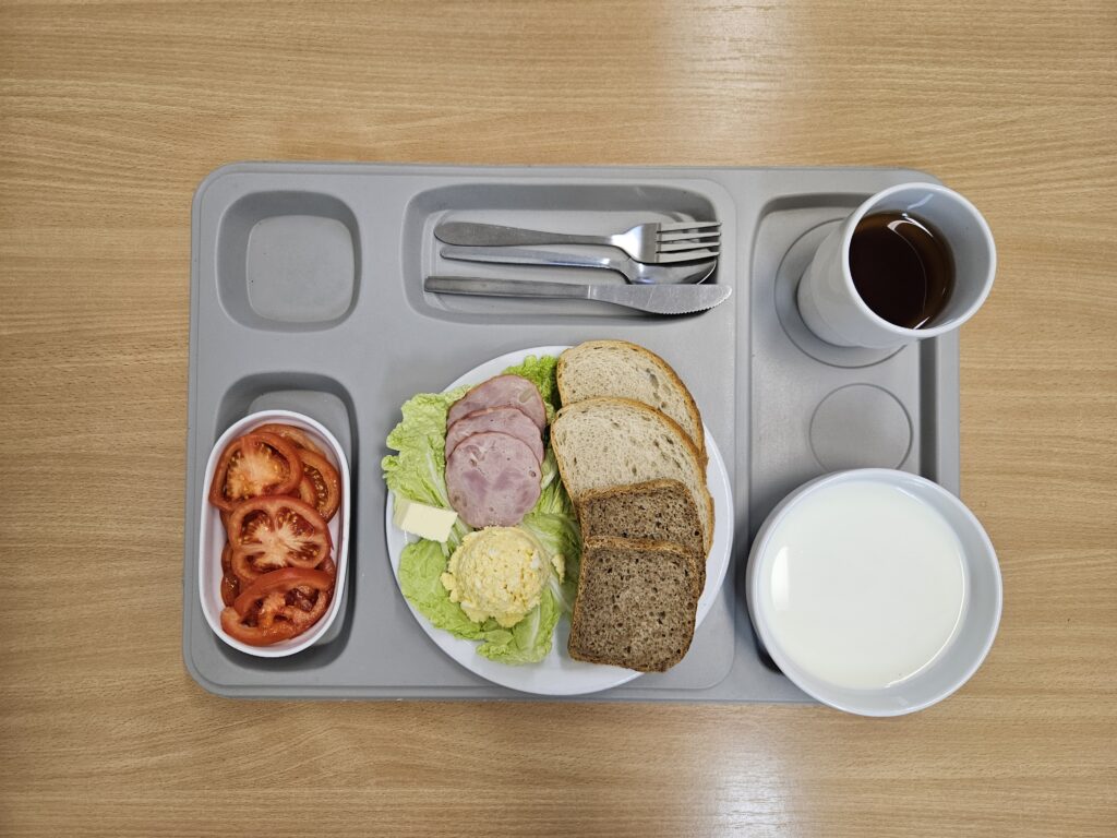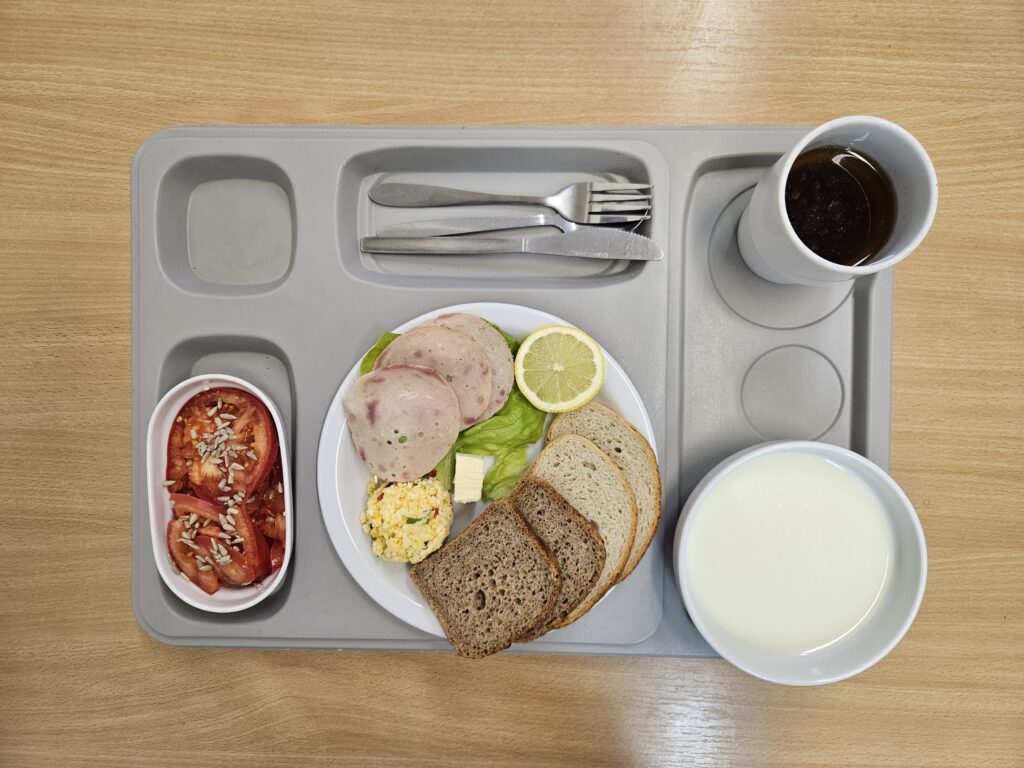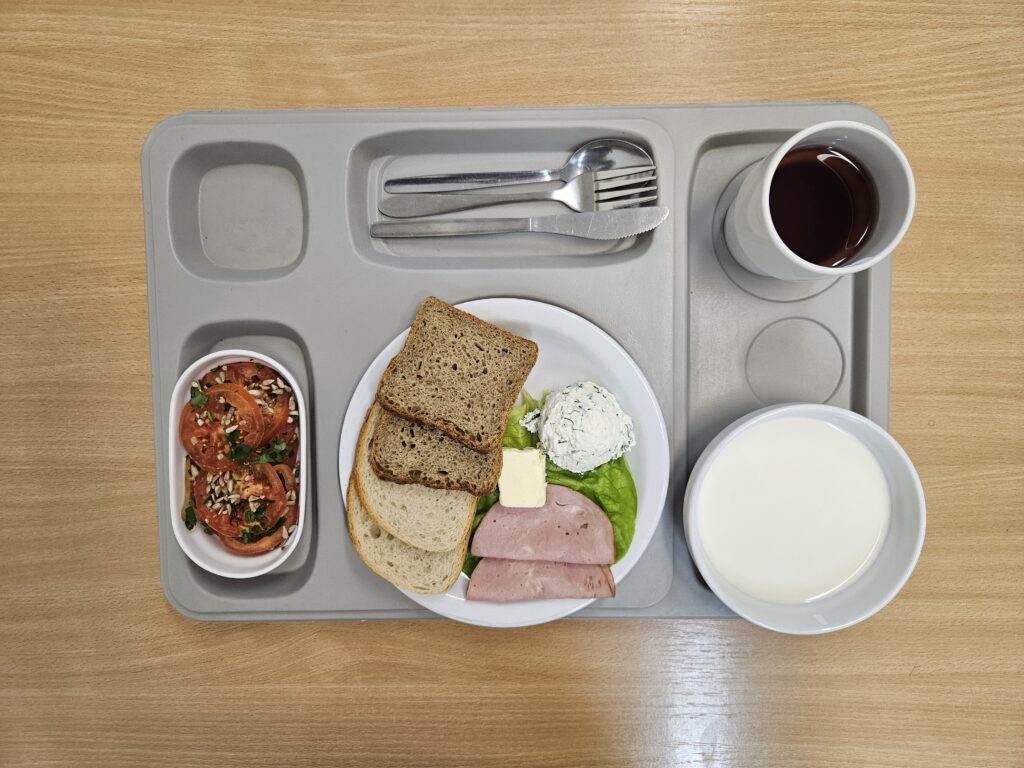 | Śniadanie: jogurt naturalny 150 g (BIA) herbata z cukrem 250 ml chleb firmowy krojony (pszenno-żytni) 50 g (GLU, JAJ, ZIA) chleb razowy krojony 50 g (GLU, JAJ, ZIA) szynka wieprzowa 50 g (BIA, GLU, SOJ, SEL, GOR) rukola 15 g masło 82% tłuszczu 15 g (BIA) pomidor z siemieniem lnianym 150 g Marmolada 50 g (DWU) | Obiad: Barszcz ukraiński z fasolą 300 ml (GLU, SEL, DWU, ROŚ) kotlet mielony wieprzowy smażony 100 g (GLU, JAJ, ZIA) ziemniaki z koperkiem 200 g surówka z kapusty kiszonej i olejem rzepakowym 150 g Kompot 250 g |