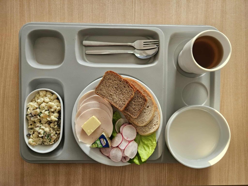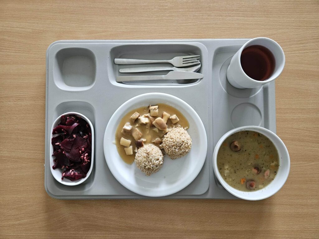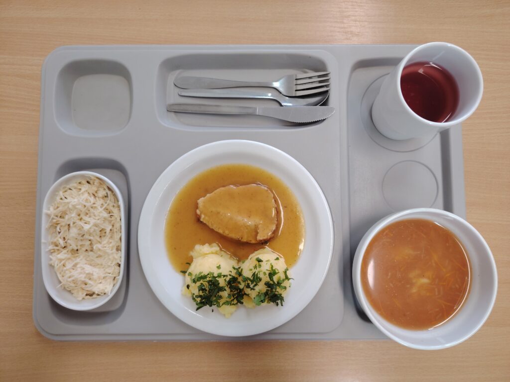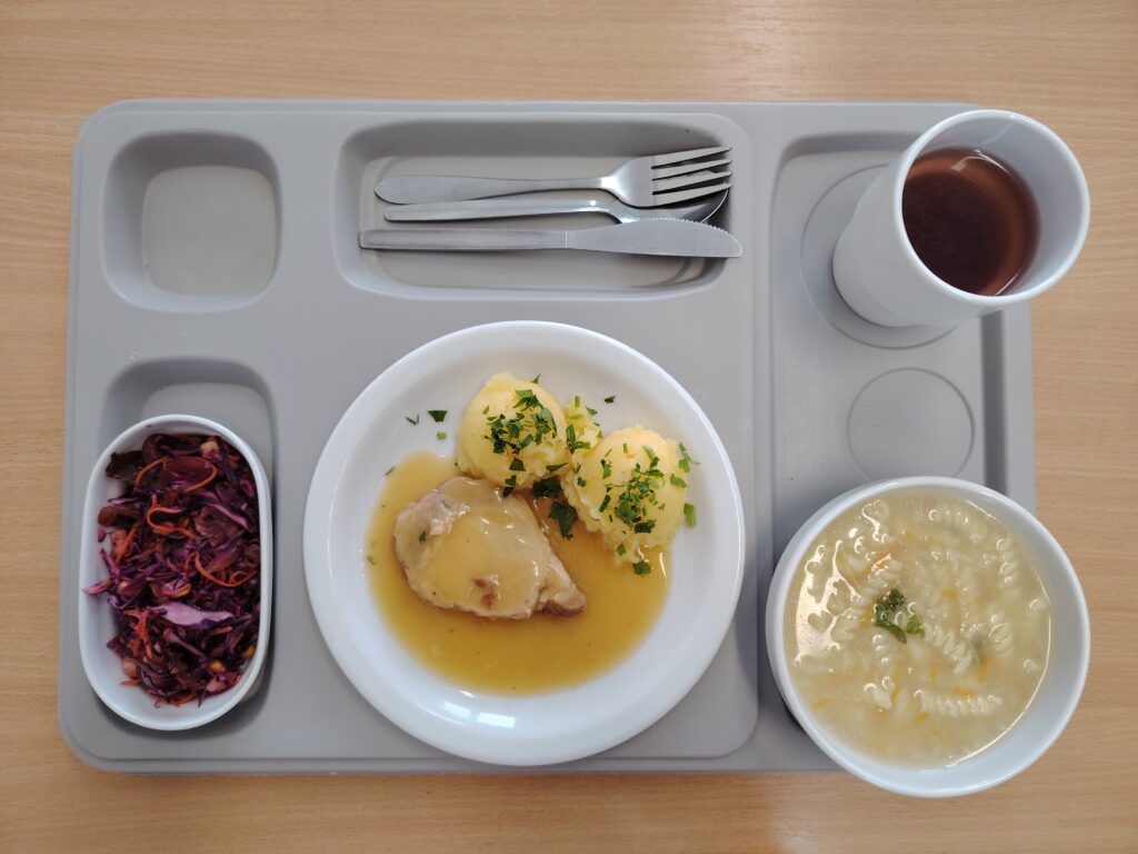 | Śniadanie zupa mleczna z zacierką 300 ml (BIA, GLU, JAJ) herbata z cytryną 250 g chleb firmowy krojony (pszenno-żytni) 50 g (GLU, JAJ, ZIA) masło 82% tłuszczu 15 g (BIA) chleb razowy krojony 50 g (GLU, JAJ, ZIA) jajko gotowane 1 szt (JAJ) sałata 20 g pomidor z siemieniem lnianym 150 g Szynka drobiowa 30 g (BIA, GLU, SOJ, SEL, GOR) | Obiad Kluski w sosie myśliwskim – z pieczarkami i papryką 350 g (BIA, GLU, JAJ, GOR) Zupa szpinakowa z ryżem 300 ml (GLU) Suówka z warzyw mieszamych z kapustą i olejem rzepakowym ze słonecznikiem 150 g (DWU) kompot wieloowocowy * 250 g ziemniaki z koperkiem 200 g |