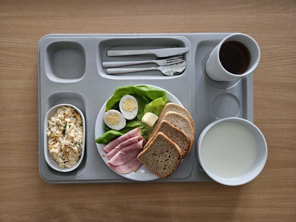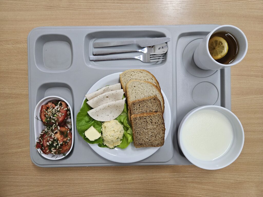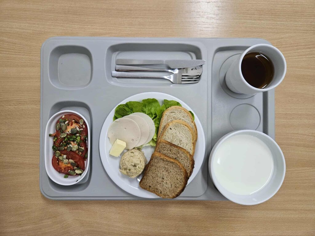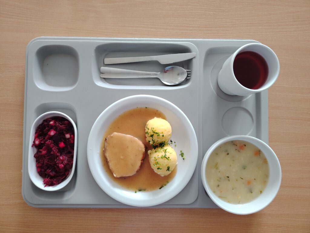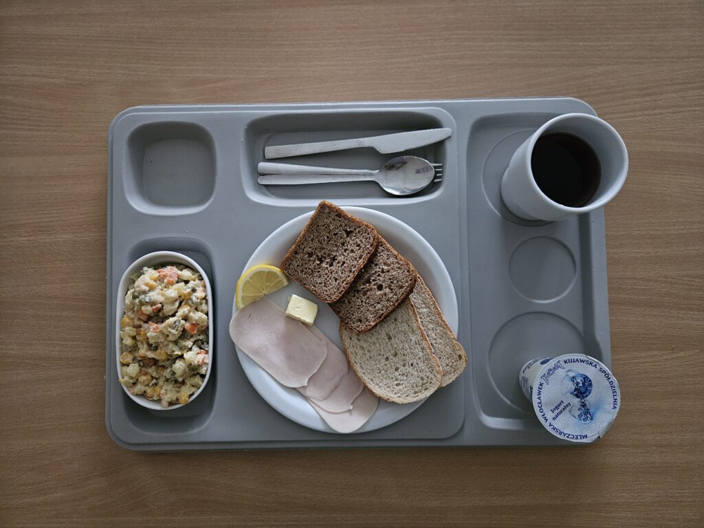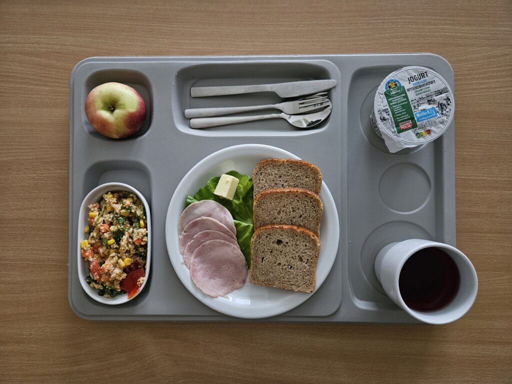 Śniadanie:jogurt naturalny 150 g(BIA) chleb firmowy krojony(pszenno-żytni) 50 g(GLU, JAJ, ZIA) masło 82% tłuszczu 15g (BIA) pasta drobiowo-jarzynowa z zieleniną 50 g (SEL) herbata z cytryną 250 g ser żółty 30 g (BIA) pomidor z siemieniem lnianym 150 g sałata 20 g chleb razowy krojony 50 g (GLU, JAJ, ZIA) | Obiad: Zupa ogórkowa z ziemniakami i zieleniną 300 ml (GLU) gulasz wieprzowy-duszony 70 g (GLU, SEL) sałatka z buraczka ze słonecznikiem i olejem rzepakowym 150 g kasza jęczmienna na sypko 200 g (GLU) sos naturalny-lekki 100g (GLU) |