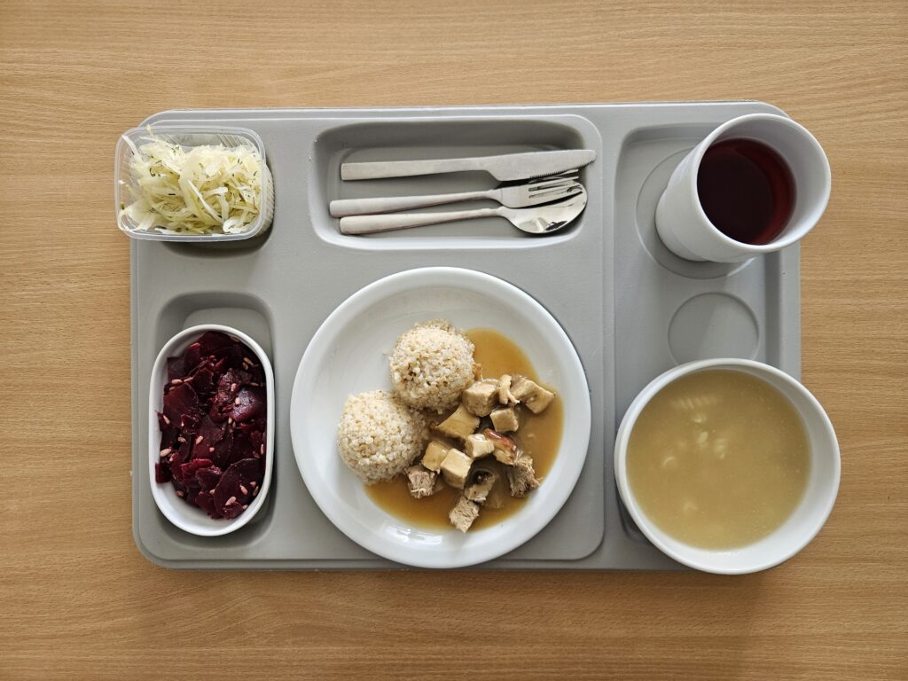 Śniadanie jogurt naturalny 150 g(BIA) masło 82% tłuszczu 15 g(BIA) chleb firmowy krojony (pszenno żytnie) 100 g(GLU, JAJ, ZIA) sałata 20 g sałatka jarzynowa lekkostrawna 150 g (JAJ,DWU) parówka* 100 g (BIA,GLU, MIĘ, SOJ, SEL) herbata z cukrem 250 ml | Filet z kurczaka gotowany 80 g (SOJ, SEL, GOR) barszcz czerwony z makaronem 300 ml (GLU, JAJ, SEL, DWU) sos potrawkowy 100 ml (GLU, JAJ, SEL) ziemniaki z koperkiem 200 g kompot wieloowocowy 250 g surówka z marchwi i jabłka z olejem rzepakowym 150g |