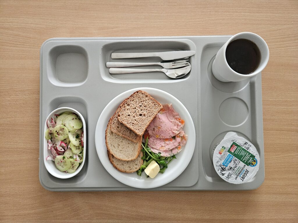 Śniadanie:jogurt naturalny 150 g (BIA) chleb firmowy krojony (pszenno-żytni) 50 g (GLU, JAJ, ZIA) masło 82% tłuszczu 15g (BIA) pasta drobiowo-jarzynowa z zieleniną 50 g (SEL) herbata z cytryną 250 g ser żółty 30 g (BIA) pomidor z siemieniem lnianym 150 g sałata 20 g chleb razowy krojony 50 g (GLU, JAJ, ZIA) | Obiad: Zupa ogórkowa z ziemniakami i zieleniną 300 ml (GLU) gulasz wieprzowy-duszony 70g (GLU, SEL) sałatka z buraczka ze słonecznikiem i olejem rzepakowym 150 g kasza jęczmienna na sypko 200 g (GLU) sos naturalny-lekki 100g (GLU) |