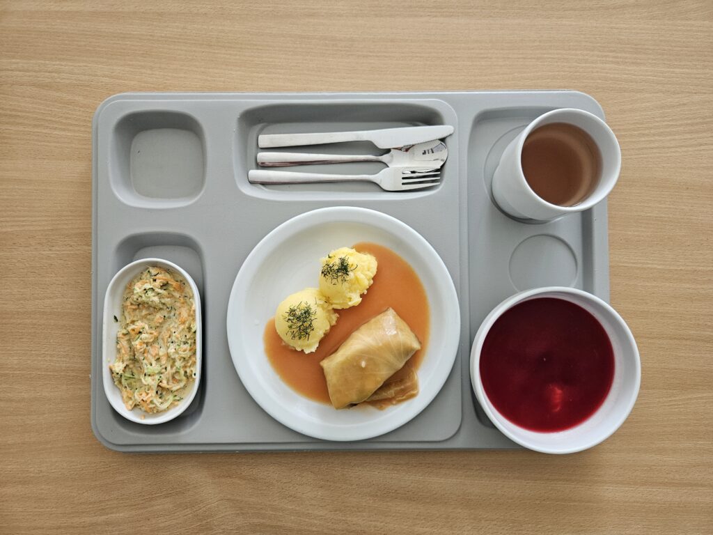 Śniadanie: jogurt naturalny 150 g (BIA) herbata z cukrem 250 ml chleb firmowy kroj, chleb razowy kroj 100 g (GLU,JAJ, ZIA) masło 82% tłuszczu 10 g (BIA) rukola 20 g kurczak w galarecie – wędlina 50 g (GLU, SOJ, SEL, GOR ) sałatka z ogórka zielonego z rzodkiewką zieleniną i olejem rzepakowym i siemieniem lnianym 150 g | Obiad: barszcz czerwony z makaronem 300 ml (GLU,JAJ, SEL, DWU) ziemniaki z koperkiem 200g (BIA) Gołąbki 250 g (JAJ) sos pomidorowy 100 ml (GLU, SOJ, SEL, GOR ) Surówka z cukinii, jabłka i marchewki 150 g (JAJ) Kompot 250 g |