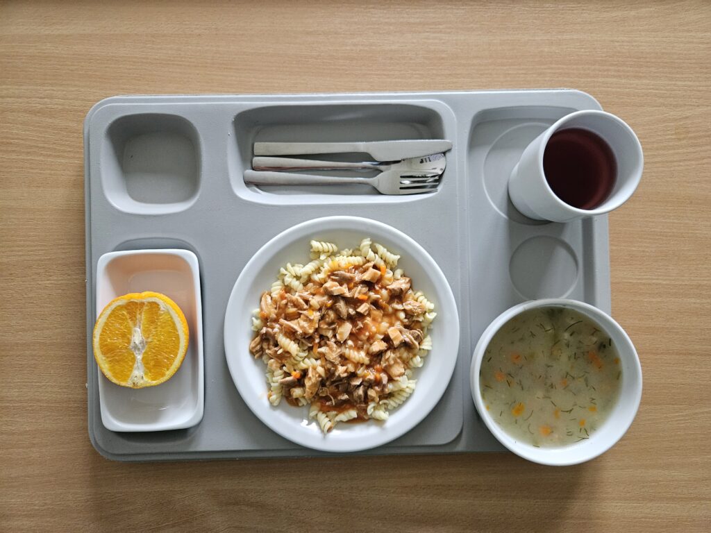 Śniadanie: herbata z cytryną 250 g chleb firmowy kroj, chleb razowy kroj 100 g (GLU,JAJ, ZIA) masło 82% tłuszczu 10 g (BIA) sałata 20 g Pasta jajeczna z papryką i szczypiorkiem 50 g (JAJ) zupa mleczna z kaszką manną 300 ml (BIA, GLU) pomidor z zieleniną i słonecznikiem 150 g kiełbasa krakowska 30 g (BIA, GLU, MIĘ, SOJ, SEL,GOR) | Obiad: Zupa koperkowa z ziemniakami 300 ml (GLU,SEL, DWU) Makaron z sosem bolońskim i mięsem 350 g (GLU,JAJ) kompot wieloowocowy 250 ml pomarańcza 150 g |