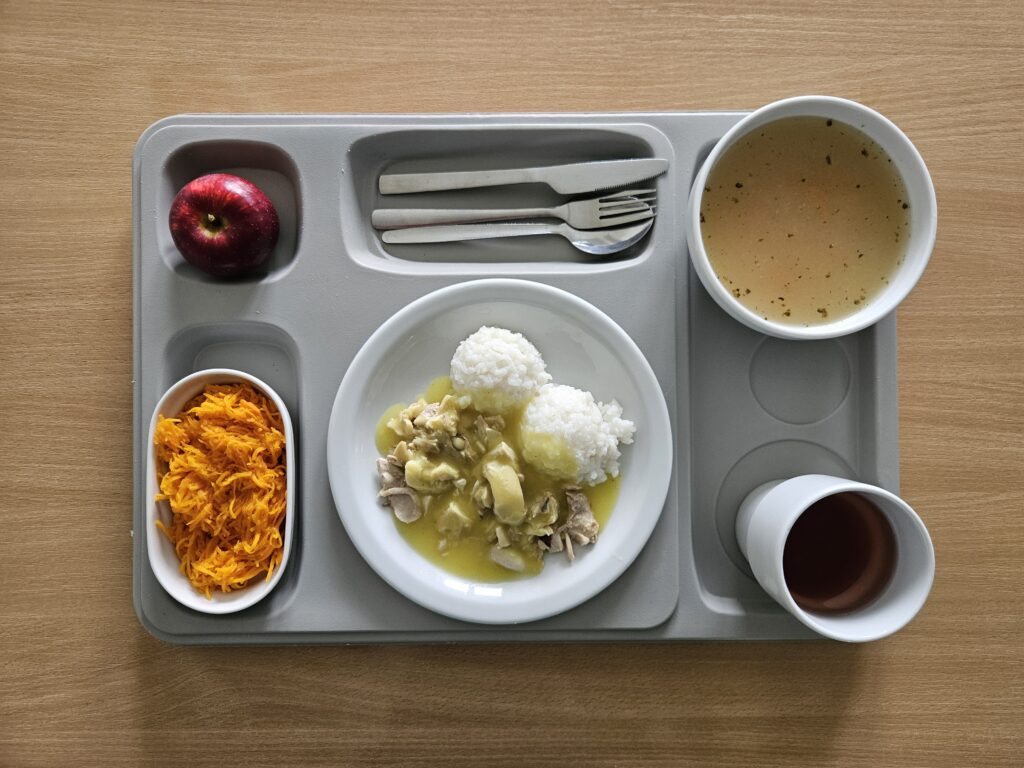 Śniadanie: masło 82% tłuszczu 10 g (BIA) chleb firmowy kroj, chleb razowy kroj 100 g (GLU,JAJ, ZIA) Wędlina drobiowa 50g (BIA,GLU, MIĘ, SOJ, SEL ) jogurt naturalny 150 g (BIA) herbata z cytryną 250 g sałatka jarzynowa z jogurtem 150 g (JAJ, DWU,GOR) | Obiad: Zupa ziemniaczana z natką pietruszki 300 ml (GLU, SEL) Kawałki kurczaka w sosie curry 100 g (GLU) surówka z dyni i jabłka 150 g ryż na sypko 200 g (BIA) jabłko 150 g |
