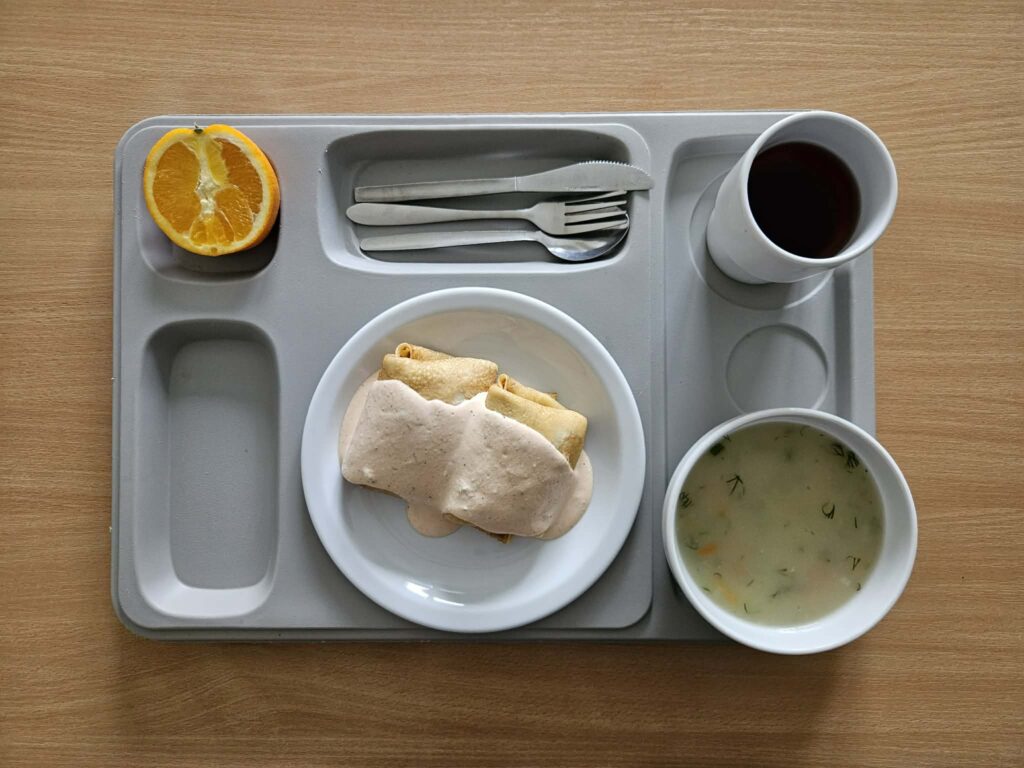 | Śniadanie: zupa mleczna z kaszką manną 300 ml (BIA, GLU) herbata z cytryną 250 g chleb firmowy krojony (pszenno-żytni) 50 g (GLU, JAJ, ZIA) masło 82% tłuszczu 15 g (BIA) chleb razowy krojony 50 g (GLU, JAJ, ZIA) Pasta jajeczna z papryką i szczypiorkiem 50 g (JAJ) roszponka 20 g pomidor z zieleniną i słonecznikiem 150 g kiełbasa krakowska 30 g (BIA, GLU, MIĘ, SOJ, SEL, GOR) | Obiad: Naleśniki ruskie 2 szt 300 g (BIA, GLU, JAJ) Zupa koperkowa z ziemniakami 300 ml (GLU, SEL, DWU) kompot ** 250 g pomarańcza 150 g sos tysiąca wysp(majonez, ketchup, chrzan) 50 g (GLU, JAJ, SEL) |