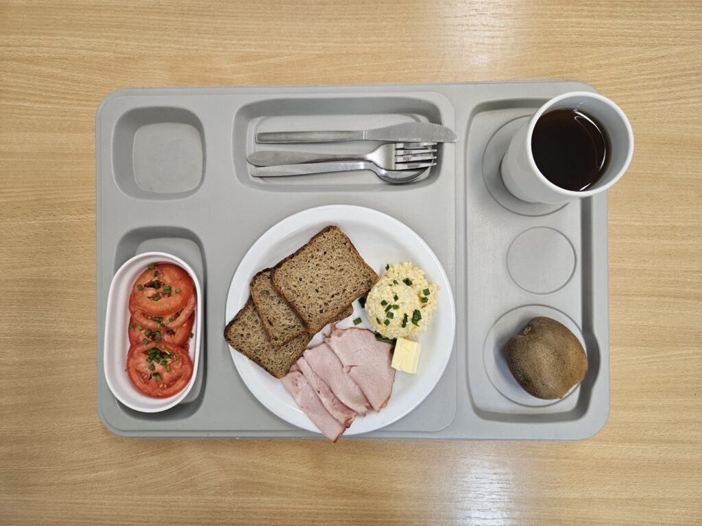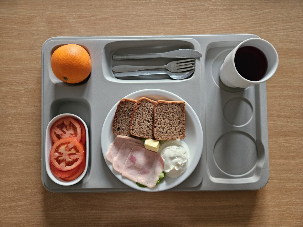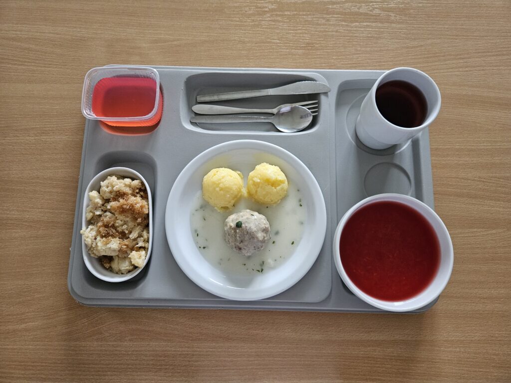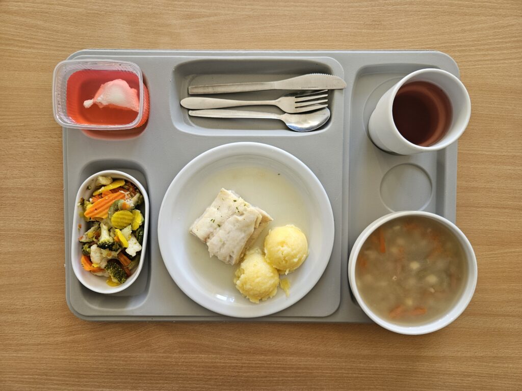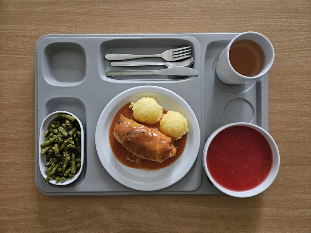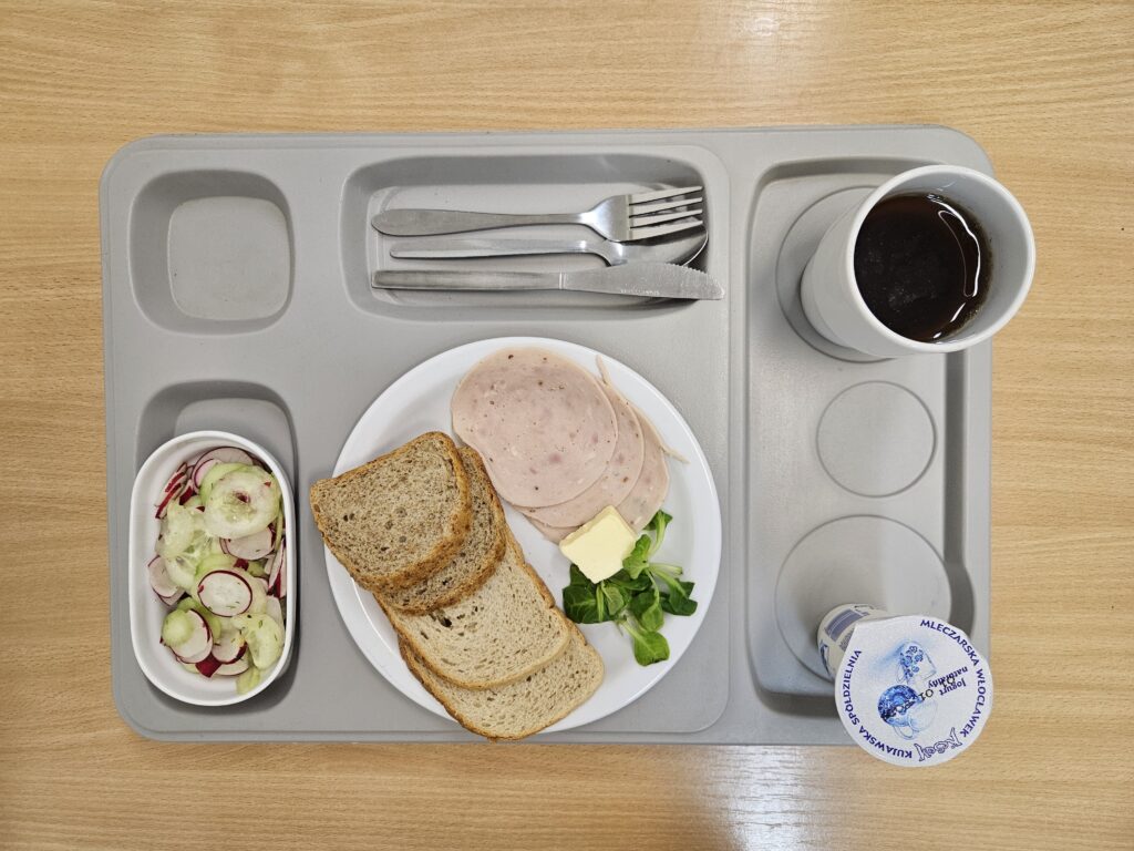 | Śniadanie: jogurt naturalny 150 g (BIA) herbata z cukrem 250 ml chleb firmowy krojony (pszenno-żytnie) 100 g (GLU, JAJ, ZIA) masło 82% tłuszczu 15g (BIA) Marmolada 50 g (DWU) polędwica drobiowa 50g (GLU, SEL, GOR) rukola 15 g pomidor 100 g | Obiad: barszcz czerwony z ziemniakami 300 ml (GLU, SOJ, SEL, GOR ) kalafior z bułką tartą i tłuszczem 150 g (GLU) Pulpet wieprzowy 90 g (BIA, GLU, JAJ, SOJ,ZIA) sos koperkowy 100 ml (GLU, SOJ, SEL, GOR ) ziemniaki z koperkiem 200 g Kompot 250 g |