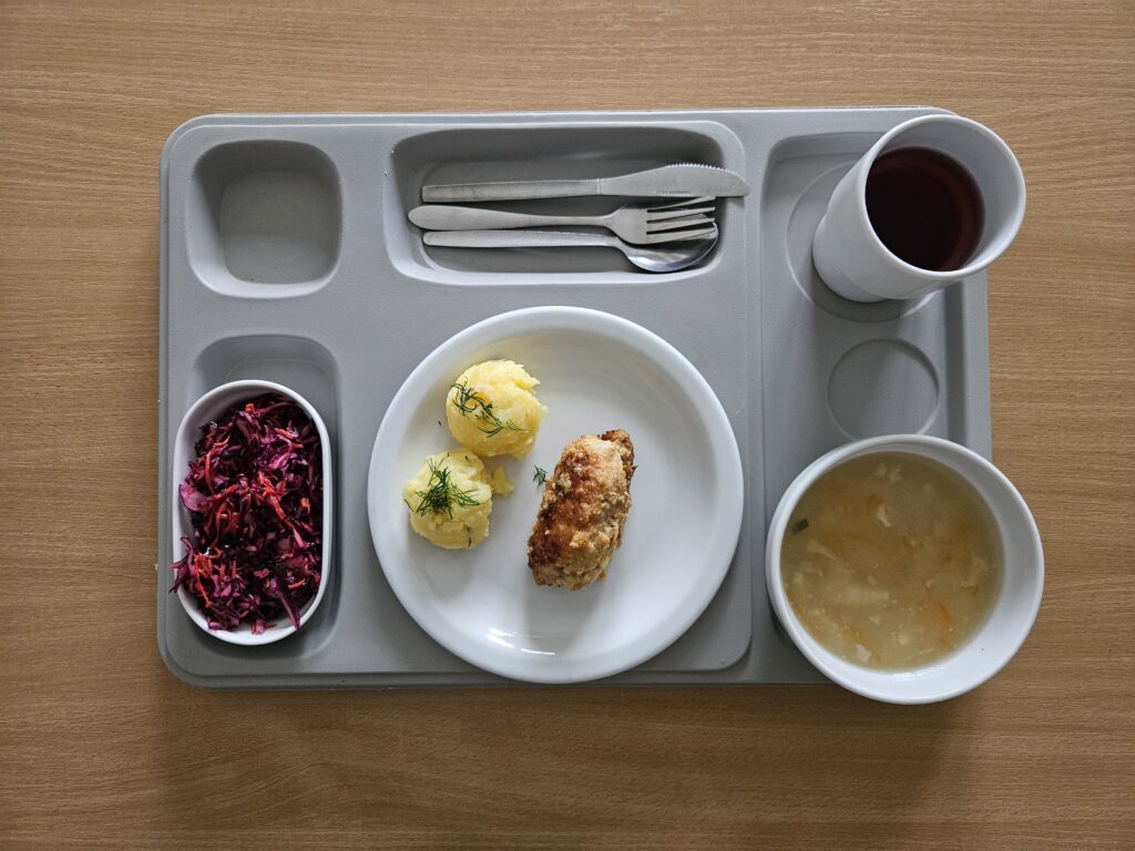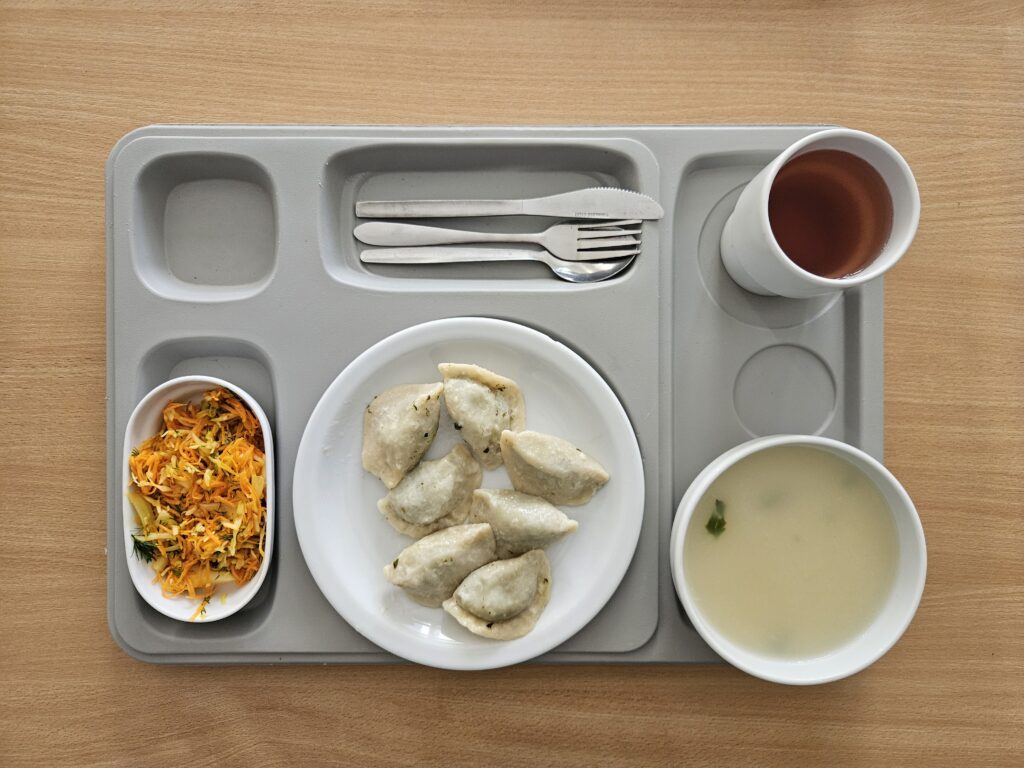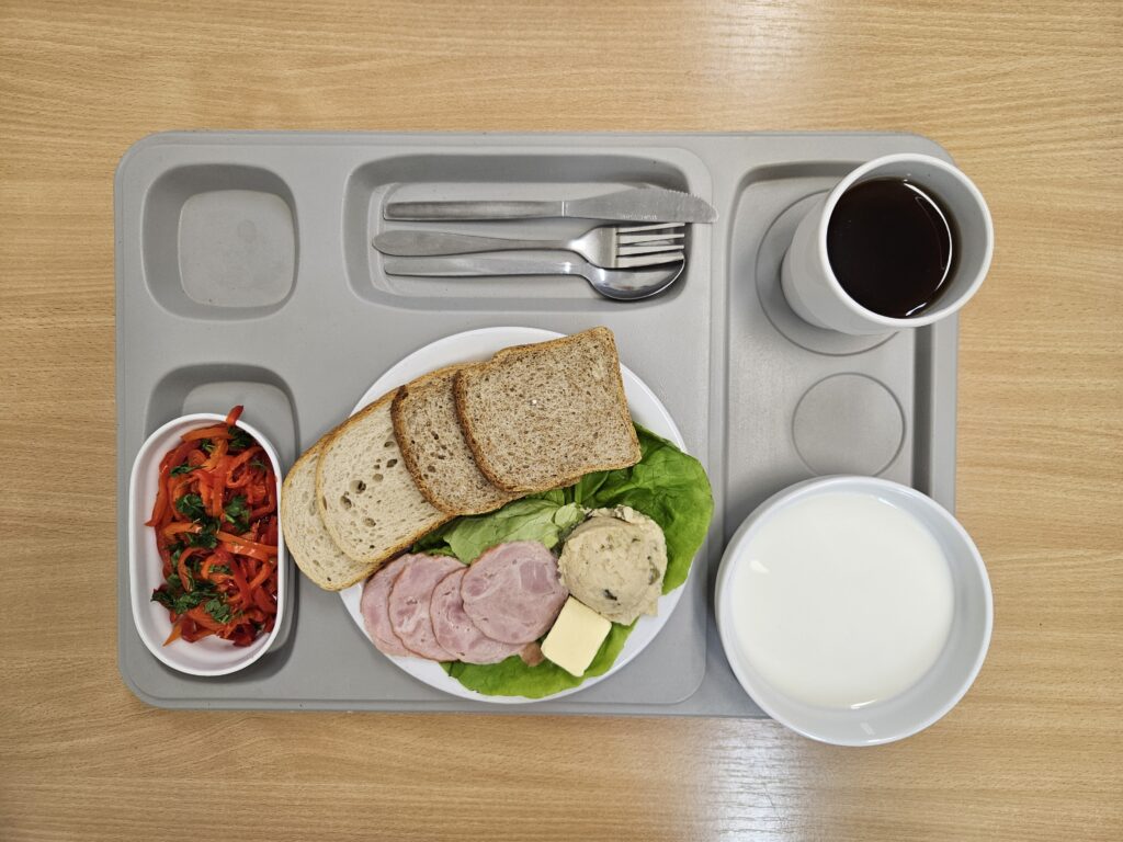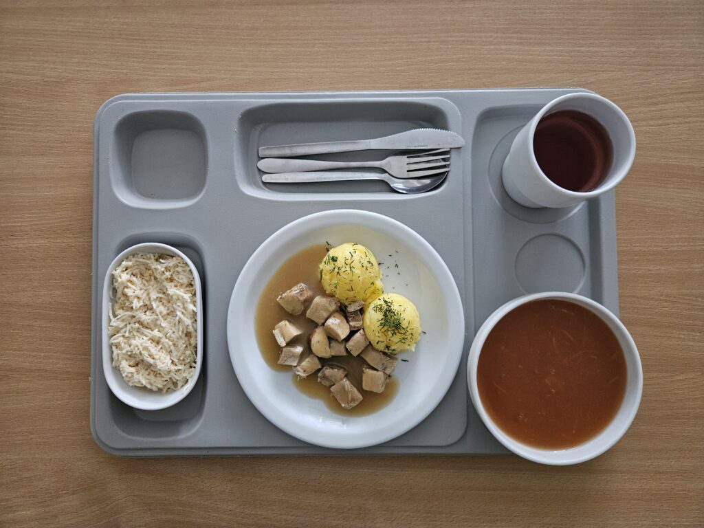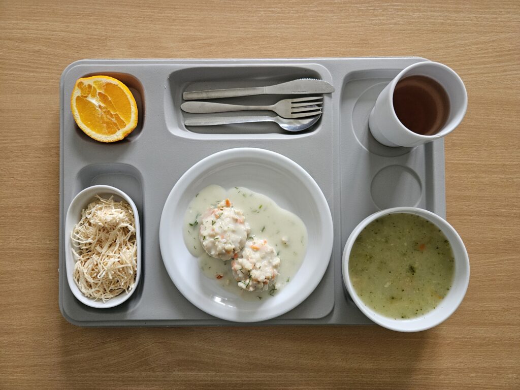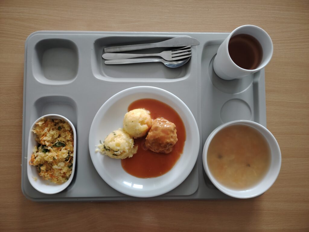 | Śniadanie: zupa mleczna z kaszą jęczmienną 300 ml (BIA, GLU) masło 82% tłuszczu 15 g (BIA) chleb firmowy krojony (pszenno-żytni) 50 g (GLU, JAJ, ZIA) chleb razowy krojony 50 g (GLU, JAJ, ZIA) sałata 20 g ser topiony 20 g sałatka pieczarkowa 150 g (GLU, JAJ, DWU) herbata z cytryną 250 g szynkowa wieprzowa 30 g (BIA, GLU, SOJ, SEL, GOR) | Obiad: ziemniaki z koperkiem 200 g (BIA) Zupa ziemniaczana z zacierką i natką pietruszki 300 g (GLU, JAJ, SOJ, SEL, GOR) kompot ** 250 g sos pomidorowy 100 ml (GLU, SOJ, SEL, GOR) Pulpet wieprzowy gotowany 90 g (GLU, JAJ, SOJ, SEL, GOR, ZIA) surówka z kapusty kiszonej i olejem rzepakowym 150 g |