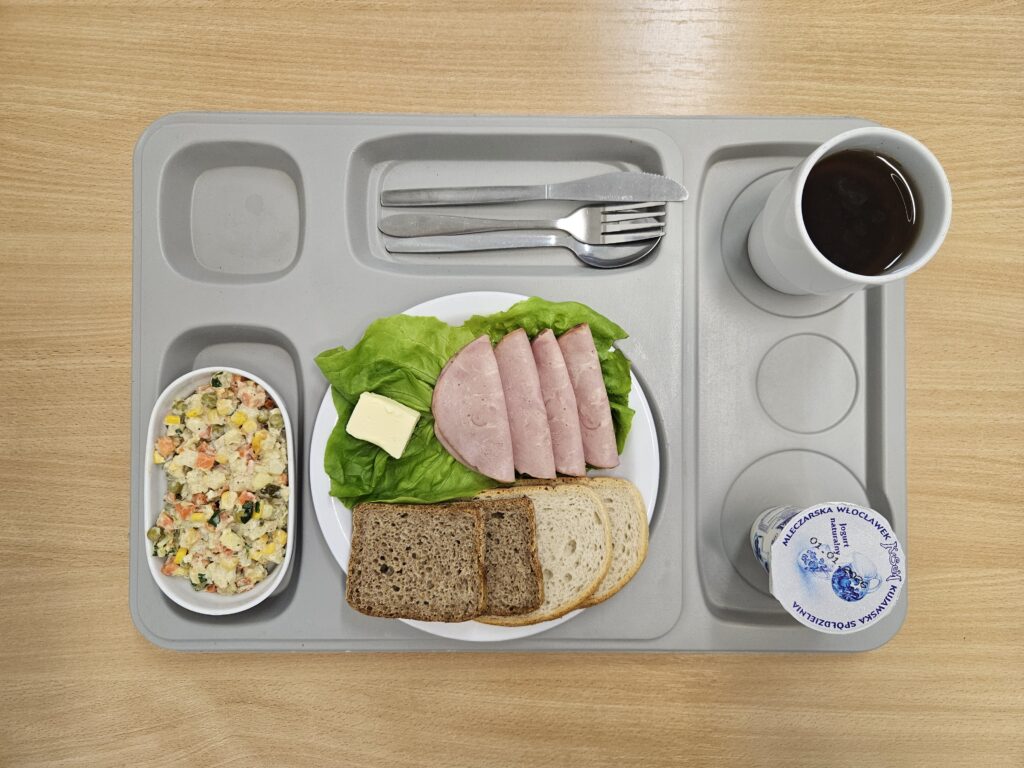 | Śniadanie: zupa mleczna z zacierką 300 ml (BIA, GLU, JAJ) herbata z cytryną 250 g chleb firmowy krojony (pszenno-żytni) 50 g (GLU, JAJ, ZIA) masło 82% tłuszczu 15g (BIA) chleb razowy krojony 50 g (GLU, JAJ, ZIA) Pasta jajeczna z papryką i szczypiorkiem 50 g (JAJ) sałata 20 g pomidor ze szczypiorkiem i pestkami dyni 150 g polędwica sopocka 30g (BIA, GLU, MIĘ, SEL,DWU) | Obiad: Żurek z kiełbasą 300 ml (BIA, GLU, MIĘ, SOJ, SEL) surówka z marchwi, seler, pietruszki i jabłka ze śmietaną 150 g (SEL) Kompot 250 g sos jogurtowo-koperkowy 100 g pierogi ze szpinakiem 300 g |