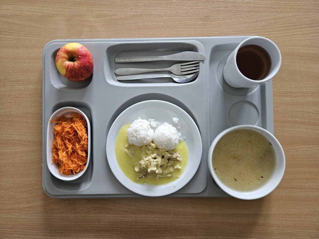 | Śniadanie: masło 82% tłuszczu 10 g (BIA) chleb firmowy kroj, chleb razowy kroj 100 g (GLU, JAJ, ZIA) sałata 20 g polędwica sopocka 50 g (BIA, GLU, MIĘ, SEL, DWU) jogurt naturalny 150 g (BIA) herbata 250 g sałatka jarzynowa z jogurtem 150 g (JAJ, DWU, GOR) | Obiad: Zupa ziemniaczana z natką pietruszki 300 ml (GLU, SEL) Kawałki kurczaka w sosie curry 150 g (GLU) surówka z marchwi i jabłka z olejem rzepakowym 150 g ryż na sypko 200 g (BIA) kompot owocowy 250 g |