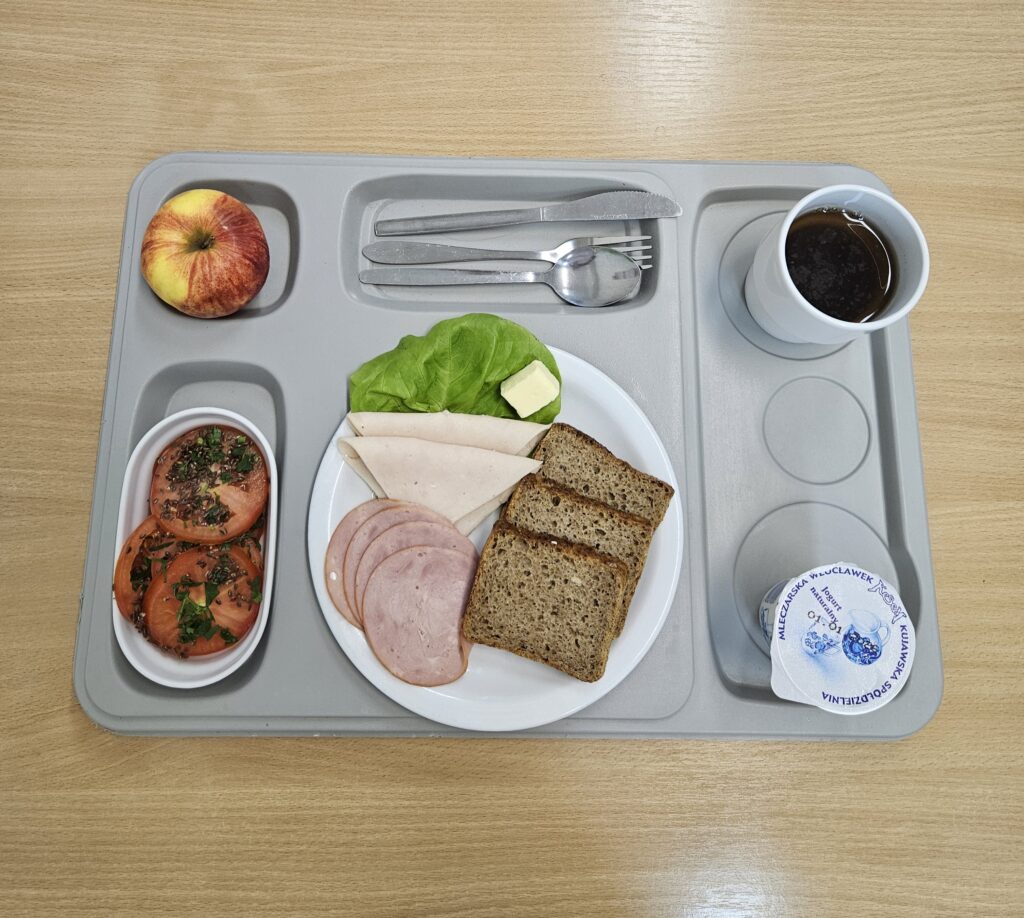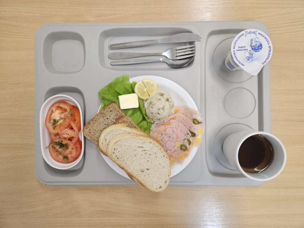| Śniadanie:jogurt naturalny 150 g (BIA) chleb firmowy krojony (pszenno-żytni) 50 g (GLU, JAJ, ZIA) masło 82% tłuszczu 15g (BIA) pasta drobiowo-jarzynowa z zieleniną 50 g (SEL) herbata z cytryną 250 g ser żółty 30 g (BIA) pomidor z siemieniem lnianym 150 g sałata 20 g chleb razowy krojony 50 g (GLU, JAJ, ZIA) | Obiad: Zupa ogórkowa z ziemniakami i zieleniną 300 ml (GLU) gulasz wieprzowy-duszony 70g (GLU, SEL) sałatka z buraczka ze słonecznikiem i olejem rzepakowym 150 g kasza jęczmienna na sypko 200 g (GLU) sos naturalny-lekki 100g (GLU) |
