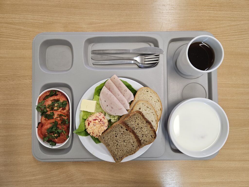 | Śniadanie:jogurt naturalny 150 g(BIA) chleb firmowy krojony(pszenno-żytni) 50 g(GLU, JAJ, ZIA) masło 82% tłuszczu 15g (BIA) kiełbasa krakowska 30g (BIA, MIĘ, SOJ, SEL,GOR) herbata z cytryną 250 g ser żółty 30 g (BIA) pomidor z siemieniem lnianym 150 g sałata 20 g chleb razowy krojony 50 g (GLU, JAJ, ZIA) | Obiad: Zupa ogórkowa z ziemniakami i zieleniną 300 ml (GLU) gulasz wieprzowy-duszony 70 g (GLU, SEL) sałatka z buraczka ze słonecznikiem i olejem rzepakowym 150 g kasza jęczmienna na sypko 200 g (GLU) sos naturalny-lekki 100g (GLU) |